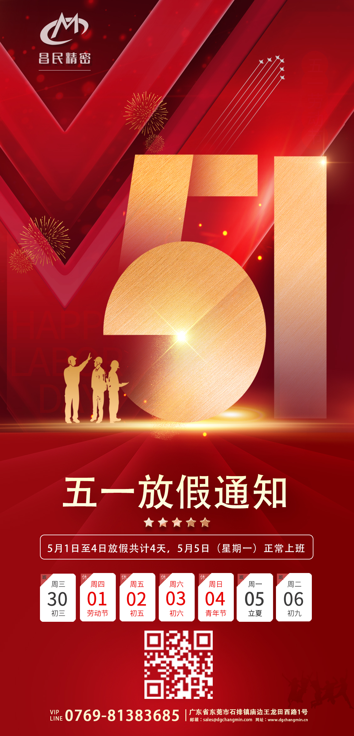 “五一”国际劳动节不仅仅是一个休息和庆祝的日子,它在纪念劳动者们通过不懈努力争取到自己合法权益的光荣历史,也在致敬每一位热爱劳动的人!这一天它也在提醒着我们,劳动是人类社会进步和发展的基石,是创造物质财富及精神财富的根本途径,是社会文明进步的重要标志。根据国家相关规定并结合我司实际情况放假通知安排如下:2025年5月1日至4日共4天,5月5日(星期一)正常上班。昌民团队致敬每一个努力生活的人,同时祝大家度过一个快乐、安全、有意义的五一假期!